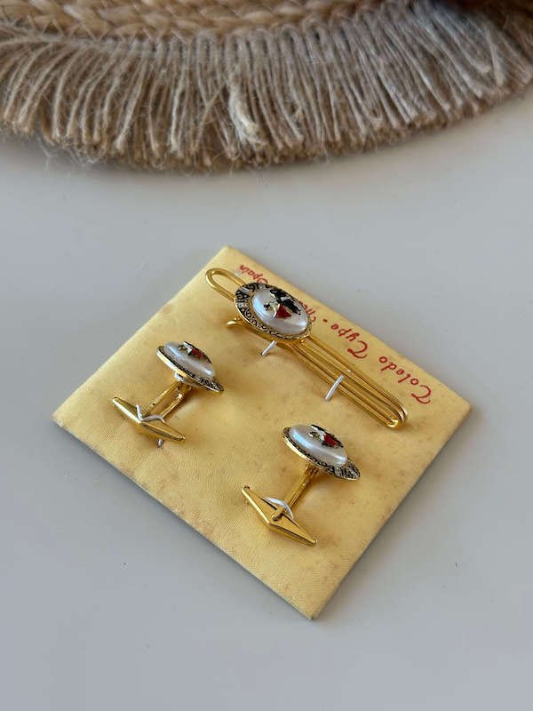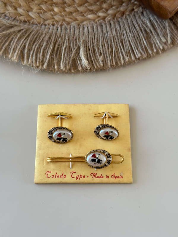 Ensemble de deux boutons de manchettes et une pince à cravate dorées Tolède, représentant un torero
