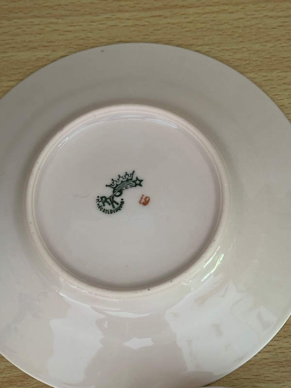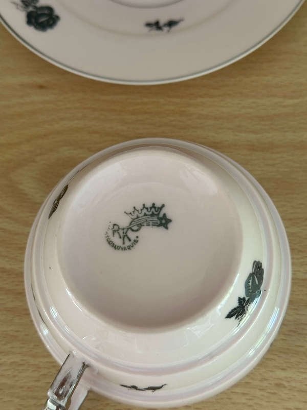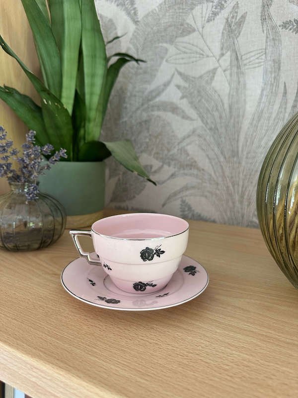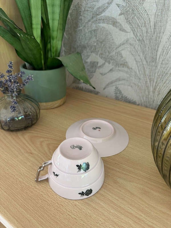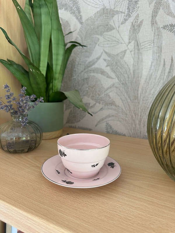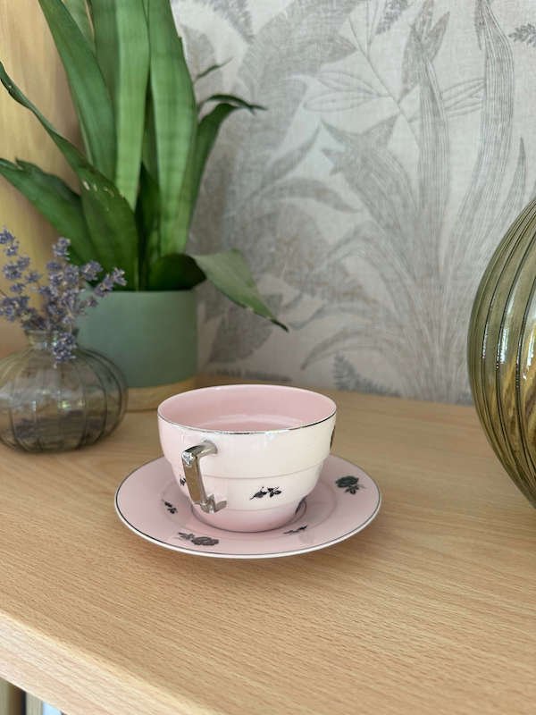 Tasse et sous tasse rose pale et argenté en porcelaine de Tchécoslovaquie RK numérotée 19